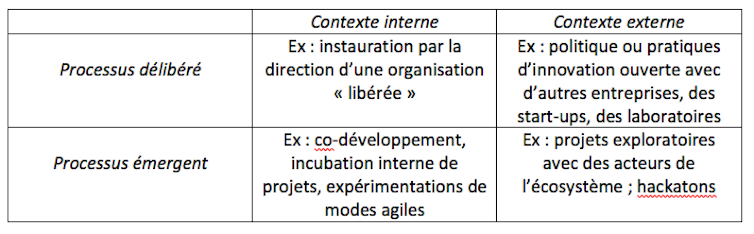 Peu ou prou, les innovations managériales qui se cachent derrière la bannière de la « transformation » relèvent donc d’une même ligne de force. À savoir, un mode de fonctionnement moins vertical et hiérarchique, au profit de logiques plus horizontales, collaboratives et en réseau. Mais ce « contenu », finalement assez homogène, masque une variété de contextes et de processus. Les chemins empruntés restent donc divers et nombreux. Le ou les modes collaboratifs peuvent ainsi être obtenus selon une variété de contextes – soit en interne, au sein même de l’organisation, soit en externe, en faisant travailler plusieurs organisations différentes –, et selon des processus plus ou moins émergents ou délibérés.
