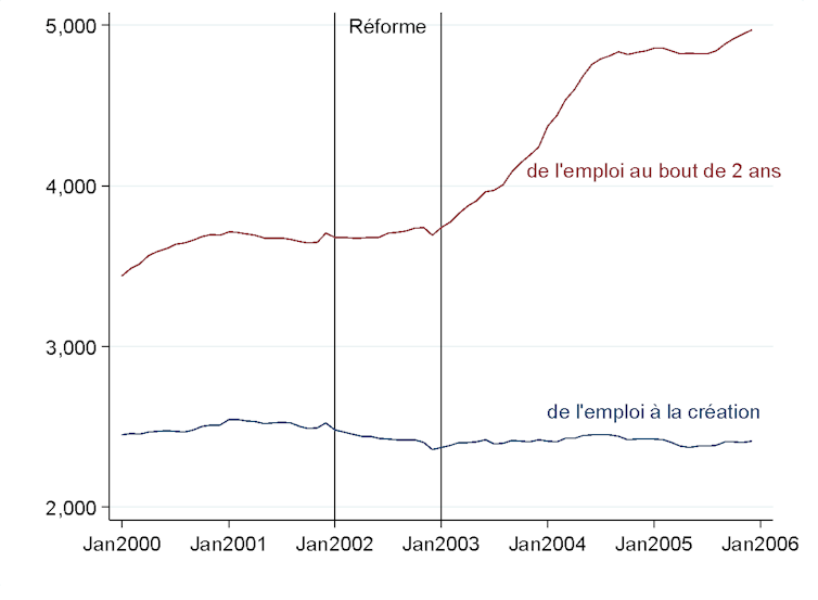 Nous répétons donc le même exercice en comptabilisant les emplois deux ans après la création. La situation est maintenant très différente. Le nombre de nouvelles entreprises comptant au moins un salarié au bout de deux ans augmente considérablement après la réforme, passant d’environ 3 500 à 5 000 par mois.